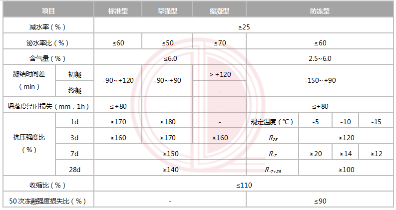 ①使用掺量:粉剂掺混凝土中胶凝材料的0.16%~0.3%,水剂掺混凝土中胶凝材料的0.8~2.0%,具体掺量应根据施工要求,经过试验后确定;